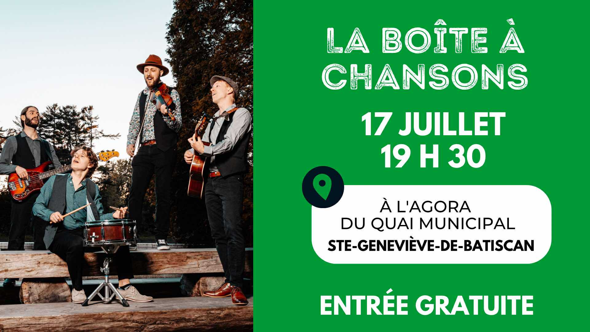 Groupe de musique festive traditionnelle et populaire qui vous fera revivre les airs oubliés du répertoire francophone. La Boîte À Chansons saura vous faire chanter et danser au son du violon et aux rythmes de nos racines.